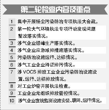同时,检查第一轮大气环境执法专项行动发现问题整改落实情况,涉气企业错峰生产落实情况。对列入2018-2019年秋冬季错峰生产的钢铁、焦化、铸造、建材、碳素、有色、化工、医药(农药)制造等行业企业错峰生产情况进行执法检查。