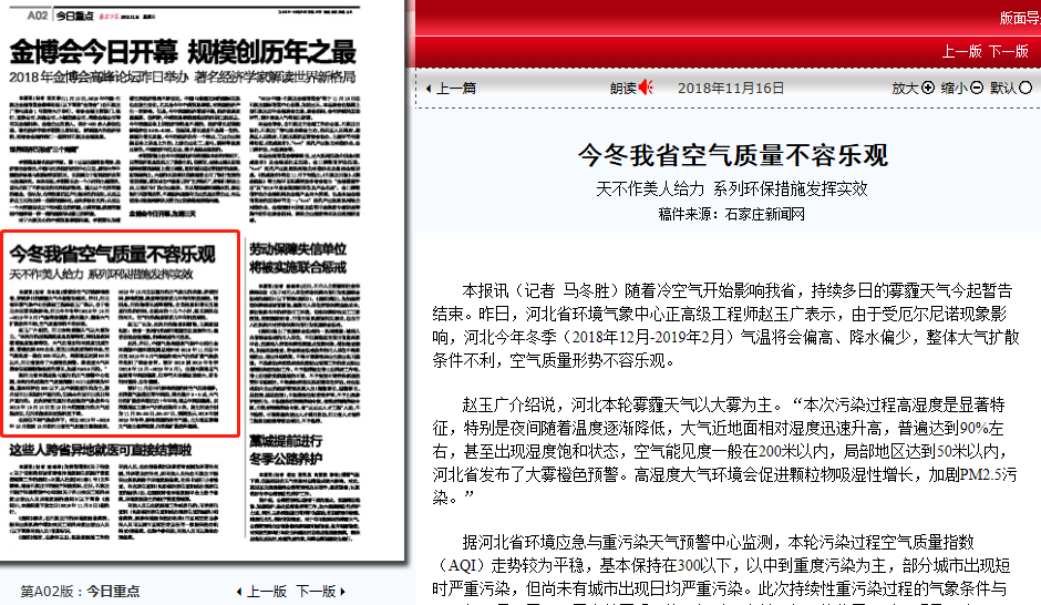 在类似不利气象条件下,对比2013年-2018年10月份到12月份河北省空气质量日数据发现,2018年10月之后重污染天气发生的次数、持续时间、影响范围、浓度峰值较前几年均有明显减轻。特别是,污染物增长速率缓慢,由良轻累积增长至重度污染的时间,由原来的十几个小时,延长到现在的两天。空气污染程度较前几年有明显减轻。 赵玉广认为,此次污染物累积缓慢,主要原因包括:我省一系列污染减排措施正在发挥作用;提前启动应急措施,削峰减速作用显现。