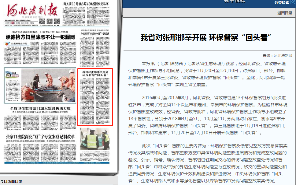2016年5月至2017年8月,河北省委、省政府组建13个环保督察组分5批次进驻各市,完成了对全省11个设区市和定州、辛集市的环境保护督察。为检验各市环境保护督察整改成效,经省委、省政府批准,河北省环境保护督察工作领导小组成立了13个督察组,分别于2018年4月至5月、10月至11月分两批对石家庄、衡水等9市开展了省委、省政府环境保护督察“回头看”。第三批督察组于11月19日进驻张家口、邢台、邯郸和辛集市,11月20日至12月10日开展环保督察“回头看”。