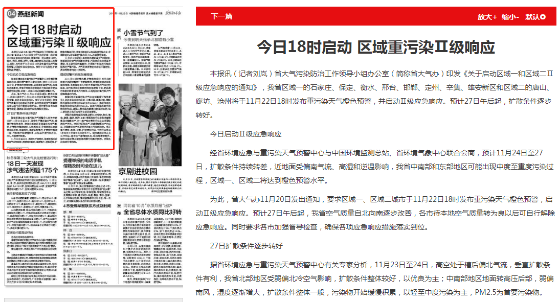 燕赵都市报:今日18时启动 区域重污染Ⅱ级响应