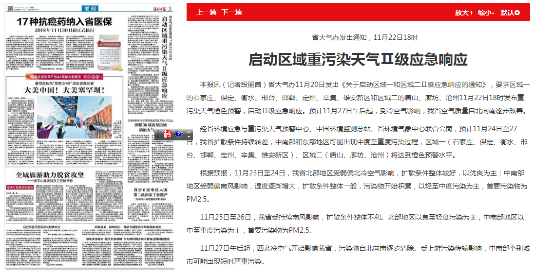 河北日报: 省大气办发出通知,11月22日18时 启动区域重污染天气Ⅱ级应急响应