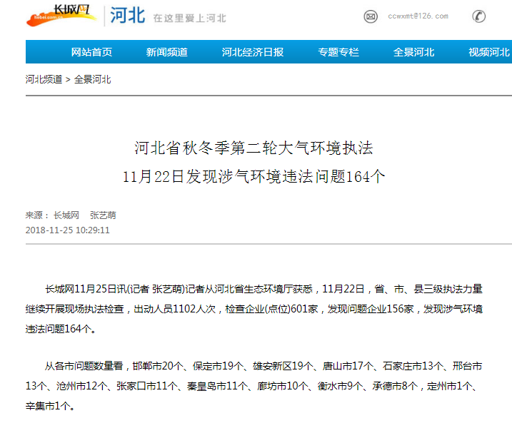 长城网:河北省秋冬季第二轮大气环境执法 11月22日发现涉气环境违法问题164个