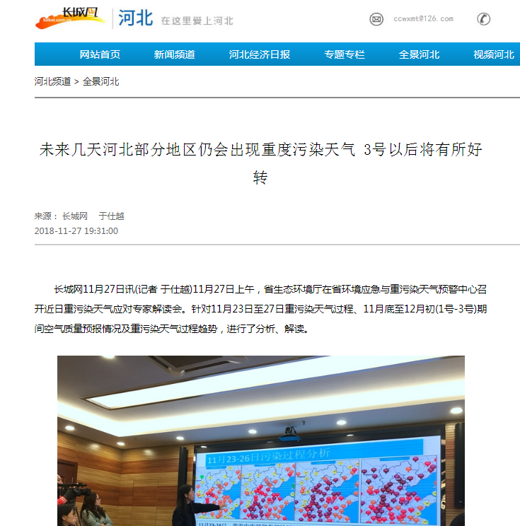 据了解,11月20日,经河北省环境应急与重污染天气预警中心与中国环境监测总站、省环境气象中心联合会商,预计11月24至27日,扩散条件持续转差,近地面受偏南气流、高湿和逆温影响,河北省中南部和东部地区可能出现中度至重度污染过程。