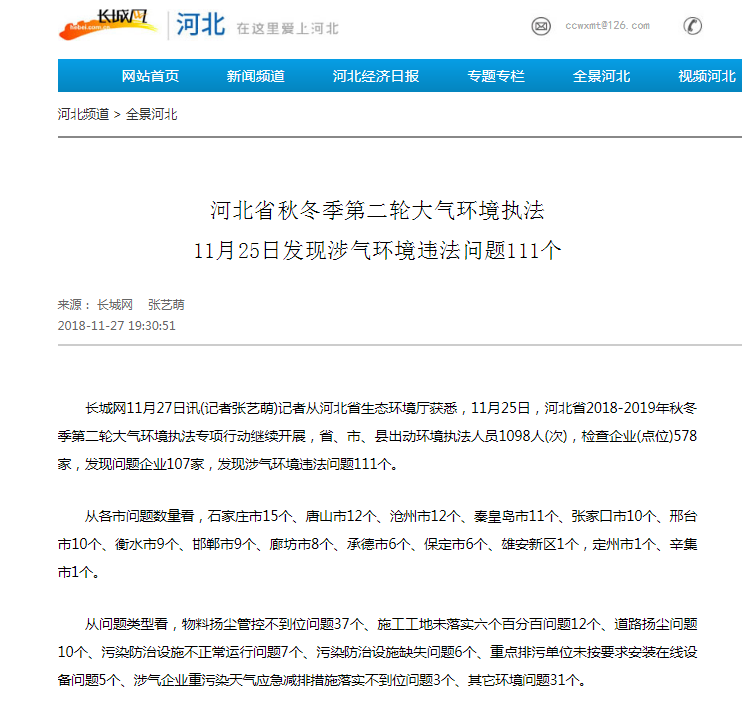 长城网11月27日讯(记者张艺萌)记者从东京热 获悉,11月25日,河北省2018-2019年秋冬季第二轮大气环境执法专项行动继续开展,省、市、县出动环境执法人员1098人(次),检查企业(点位)578家,发现问题企业107家,发现涉气环境违法问题111个。