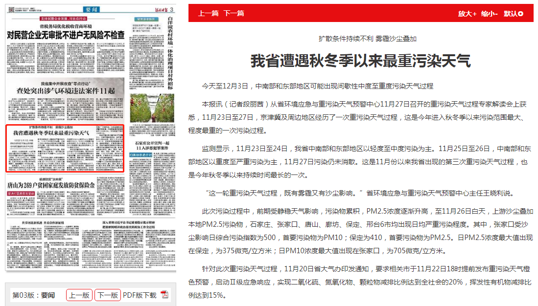 河北日报: 扩散条件持续不利 雾霾沙尘叠加 我省遭遇秋冬季以来最重污染天气