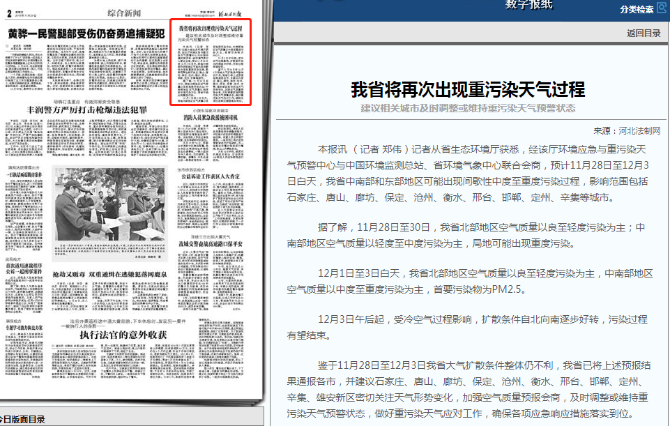 获悉,经该厅环境应急与重污染天气预警中心与中国环境监测总站、省环境气象中心联合会商,预计11月28日至12月3日白天,我省中南部和东部地区可能出现间歇性中度至重度污染过程,影响范围包括石家庄、唐山、廊坊、保定、沧州、衡水、邢台、邯郸、定州、辛集等城市。