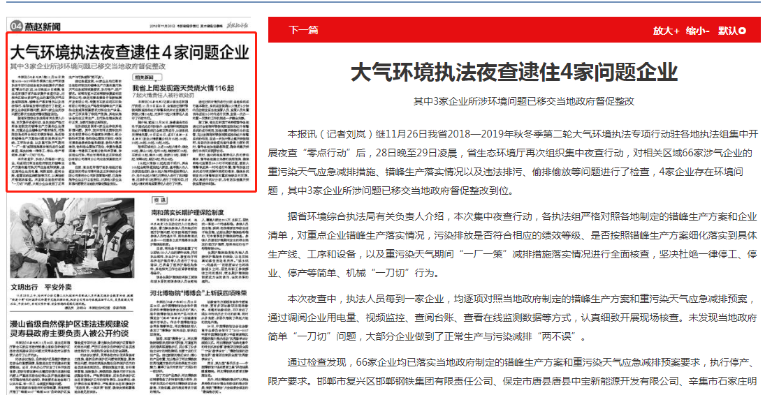 燕赵都市报:大气环境执法夜查逮住4家问题企业