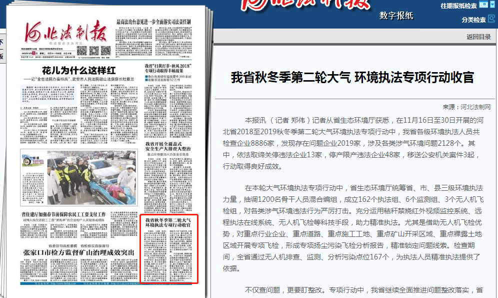 获悉,在11月16日至30日开展的河北省2018至2019秋冬季第二轮大气环境执法专项行动中,我省各级环境执法人员共检查企业8886家,发现存在问题企业2019家,涉及各类涉气环境问题2128个。其中,依法取缔关停违法企业13家,停产限产违法企业48家,移送公安机关案件3起,行动取得良好成效。