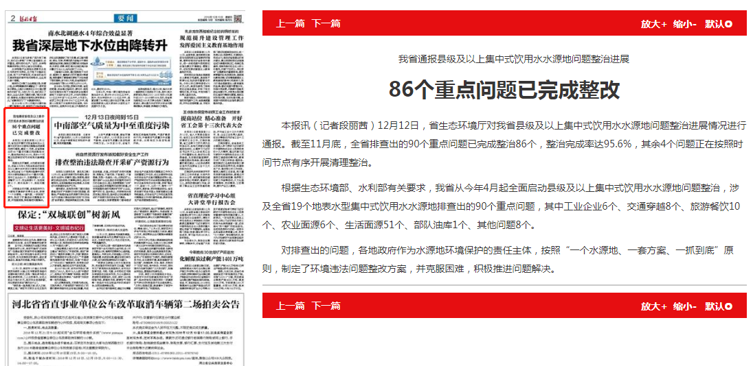 河北日报:我省通报县级及以上集中式饮用水水源地问题整治进展 86个重点问题已完成整改
