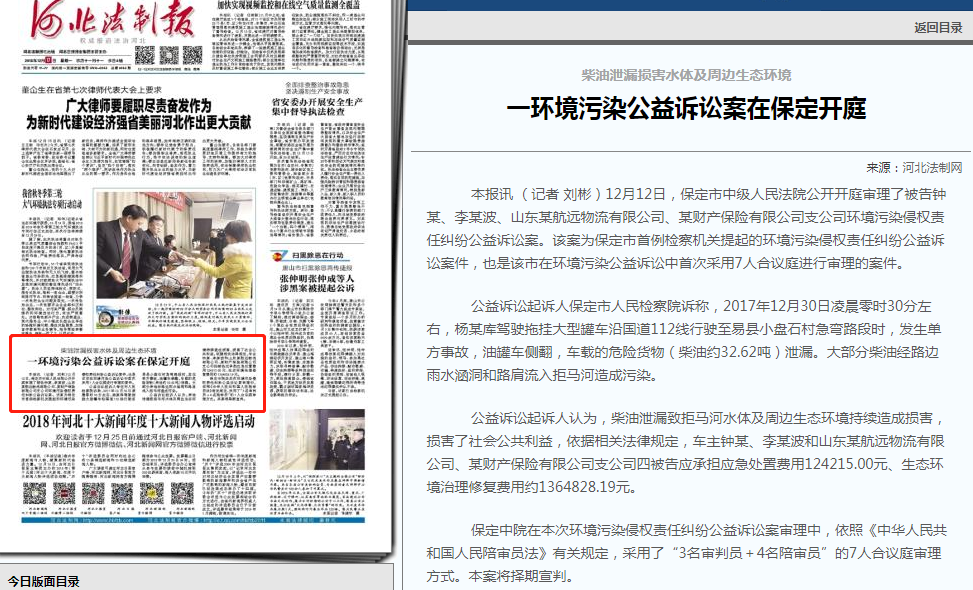 本报讯 (记者 刘彬)12月12日,保定市中级人民法院公开开庭审理了被告钟某、李某波、山东某航远物流有限公司、某财产保险有限公司支公司环境污染侵权责任纠纷公益诉讼案。该案为保定市首例检察机关提起的环境污染侵权责任纠纷公益诉讼案件,也是该市在环境污染公益诉讼中首次采用7人合议庭进行审理的案件。
