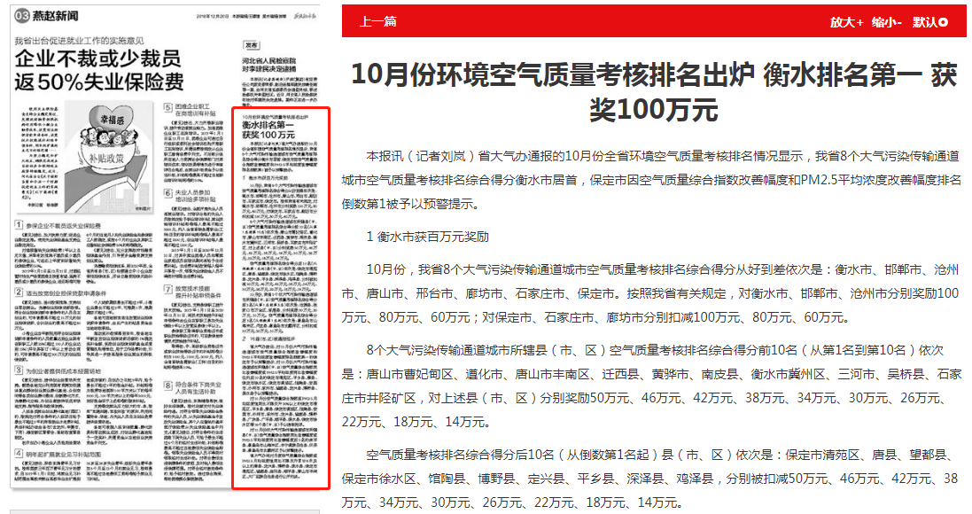 燕赵都市报:10月份环境空气质量考核排名出炉 衡水排名第一 获奖100万元