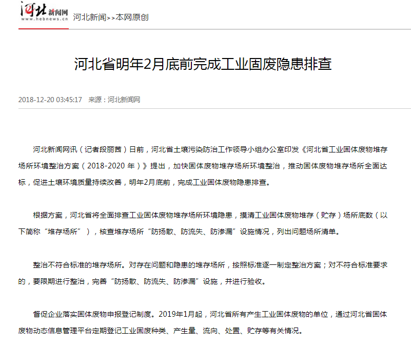 河北新闻网:河北省明年2月底前完成工业固废隐患排查