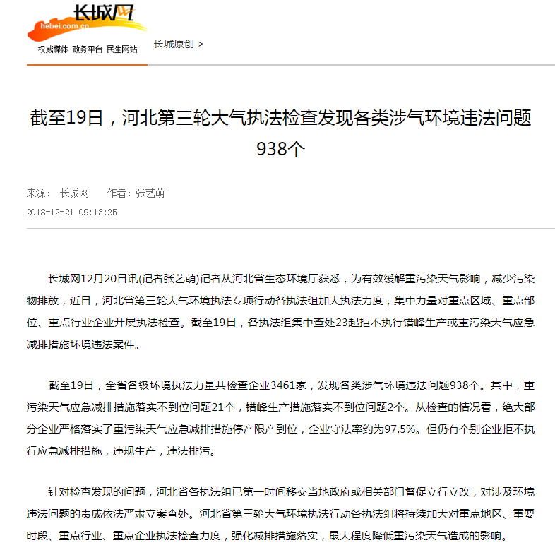 长城网:截至19日,河北第三轮大气执法检查发现各类涉气环境违法问题938个
