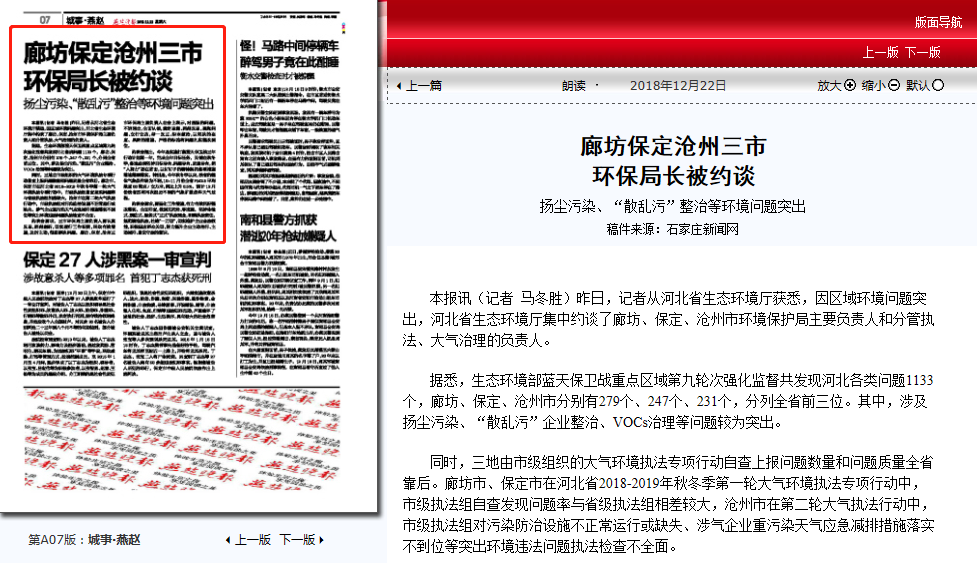 燕赵晚报:廊坊保定沧州三市环保局长被约谈