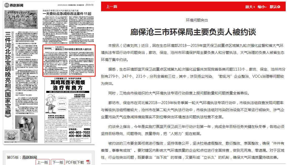 燕赵都市报:环境问题突出 廊保沧三市环保局主要负责人被约谈