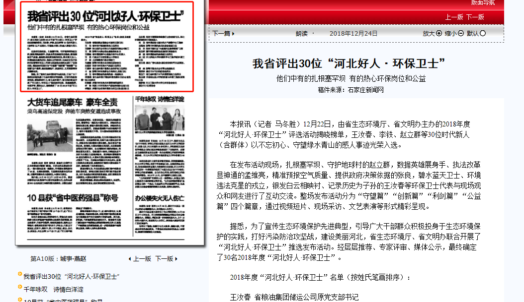 燕赵晚报:我省评出30位“河北好人·环保卫士”