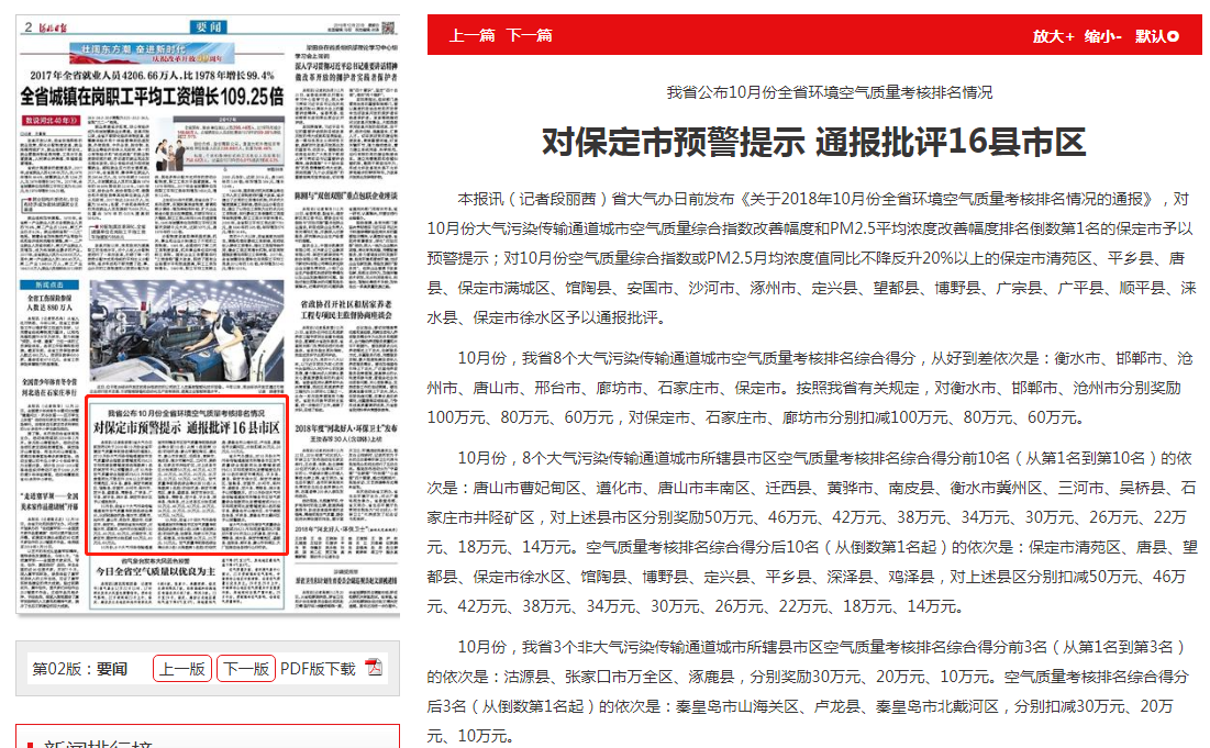 河北日报:我省公布10月份全省环境空气质量考核排名情况 对保定市预警提示 通报批评16县市区