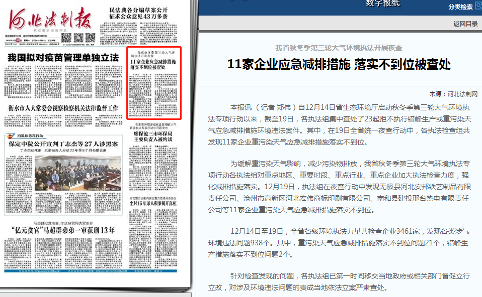 河北法制报:我省秋冬季第三轮大气环境执法开展夜查 11家企业应急减排措施 落实不到位被查处