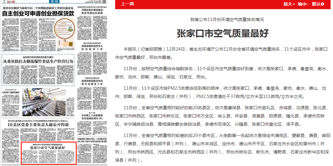 河北日报:我省公布11月份环境空气质量排名情况 张家口市空气质量最好