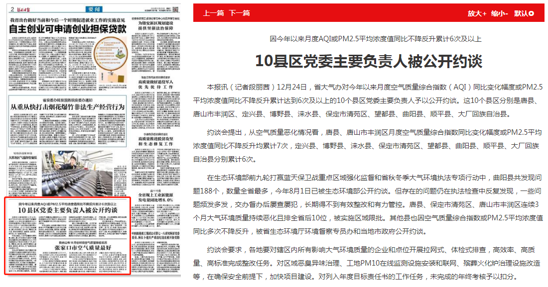 河北日报:因今年以来月度AQI或PM2.5平均浓度值同比不降反升累计6次及以上 10县区党委主要负责人被公开约谈