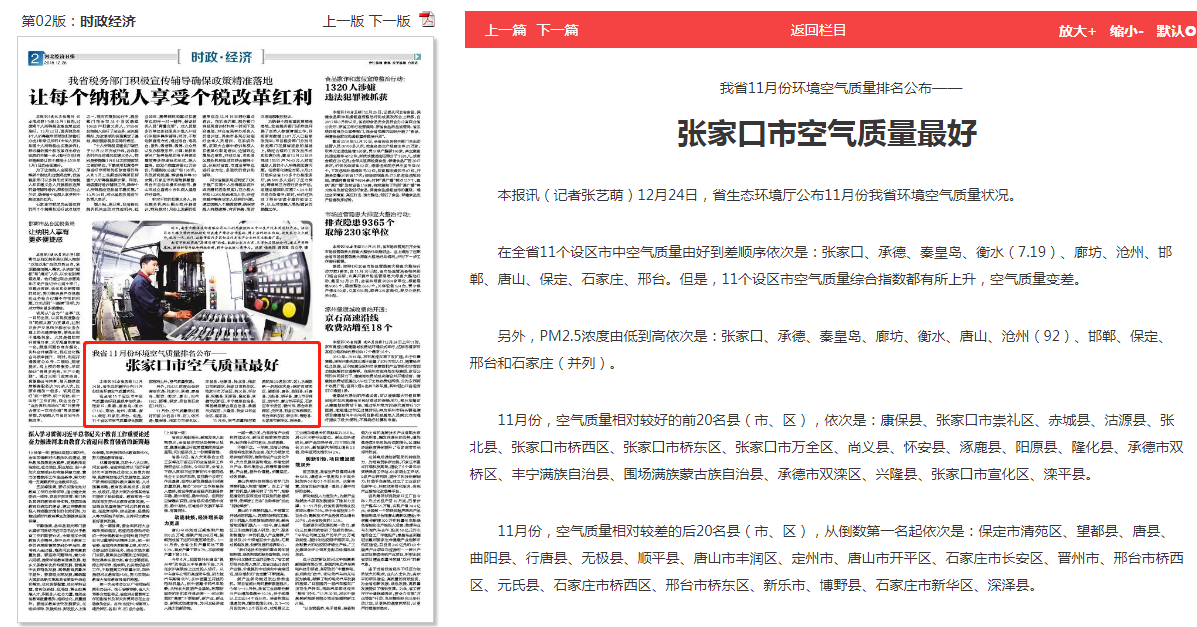 河北经济日报:我省11月份环境空气质量排名公布——张家口市空气质量最好