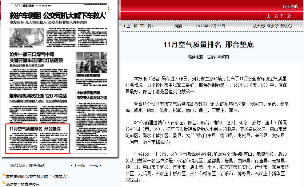 本报讯(记者 马冬胜)昨日,东京热 公布了11月份全省环境空气质量排名情况。11个设区市中张家口最好,邢台列倒数第一;168个县(市、区)中,康保县最好,保定市清苑区位列倒数第一。