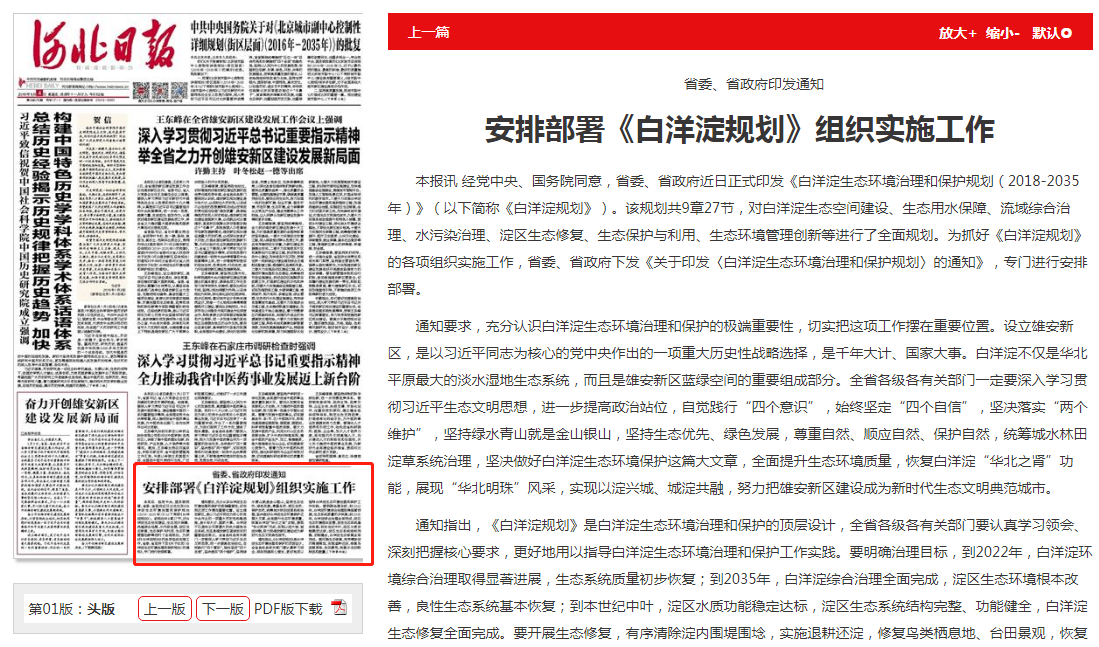 河北日报:省委、省政府印发通知 安排部署《白洋淀规划》组织实施工作