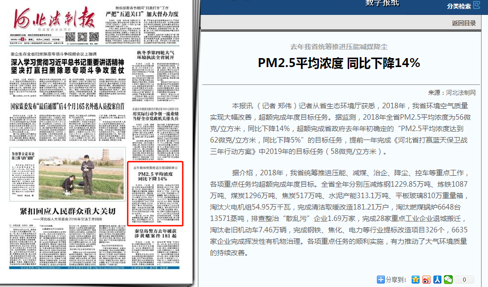 河北法制报:去年我省统筹推进压能减煤降尘PM2.5平均浓度 同比下降14%