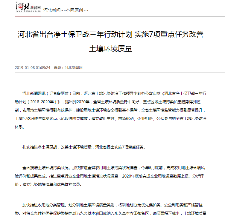 河北新闻网:河北省出台净土保卫战三年行动计划 实施7项重点任务改善土壤环境质量