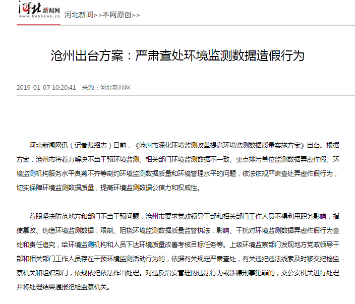 河北新闻网:沧州出台方案:严肃查处环境监测数据造假行为