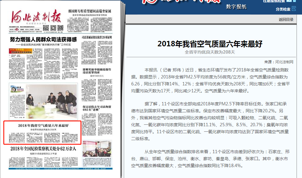据了解,11个设区市全部完成2018年度PM2.5下降率目标任务。张家口和承德市达到国家环境空气质量二级标准。保定市改善幅度最大,同比下降20.2%。另外,我省其他空气污染物指标同比改善也均较明显:可吸入颗粒物、二氧化硫、二氧化氮、一氧化碳年均浓度同比分别下降11.1%、25.9%、8.5%、20.7%;臭氧年均浓度同比持平。11个设区市的二氧化硫、一氧化碳年均浓度均达到了国家环境空气质量二级标准。