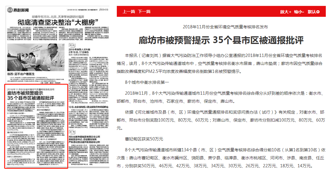 燕赵都市报:廊坊市被预警提示 35个县市区被通报批评