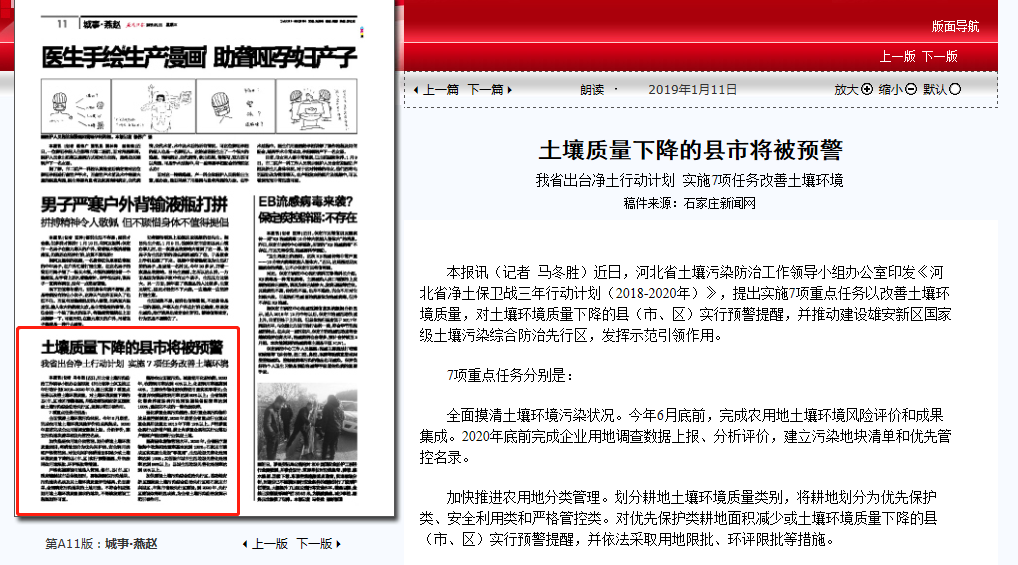 本报讯(记者 马冬胜)近日,河北省土壤污染防治工作领导小组办公室印发《河北省净土保卫战三年行动计划(2018-2020年)》,提出实施7项重点任务以改善土壤环境质量,对土壤环境质量下降的县(市、区)实行预警提醒,并推动建设雄安新区国家级土壤污染综合防治先行区,发挥示范引领作用。