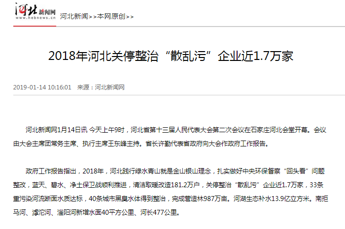 河北新闻网:2018年河北关停整治“散乱污”企业近1.7万家