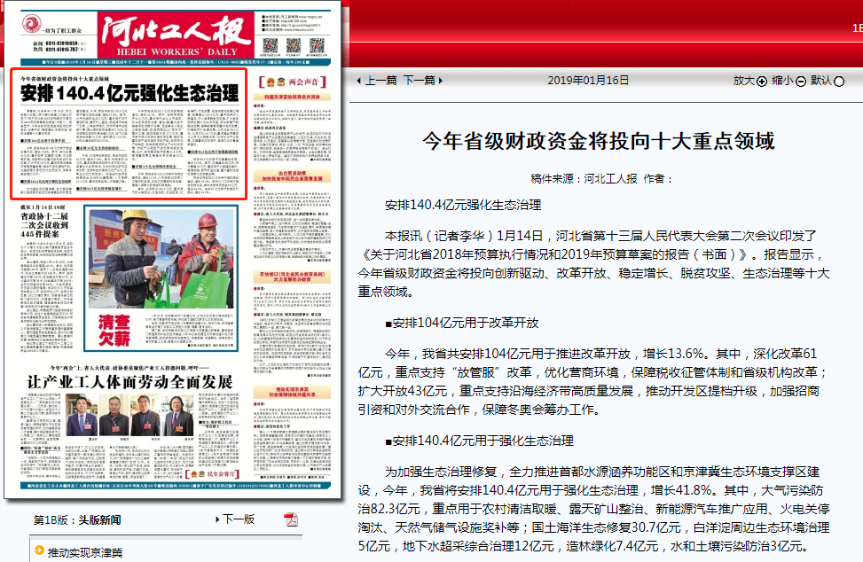 为加强生态治理修复,全力推进首都水源涵养功能区和京津冀生态环境支撑区建设,今年,我省将安排140.4亿元用于强化生态治理,增长41.8%。其中,大气污染防治82.3亿元,重点用于农村清洁取暖、露天矿山整治、新能源汽车推广应用、火电关停淘汰、天然气储气设施奖补等;国土海洋生态修复30.7亿元,白洋淀周边生态环境治理5亿元,地下水超采综合治理12亿元,造林绿化7.4亿元,水和土壤污染防治3亿元。