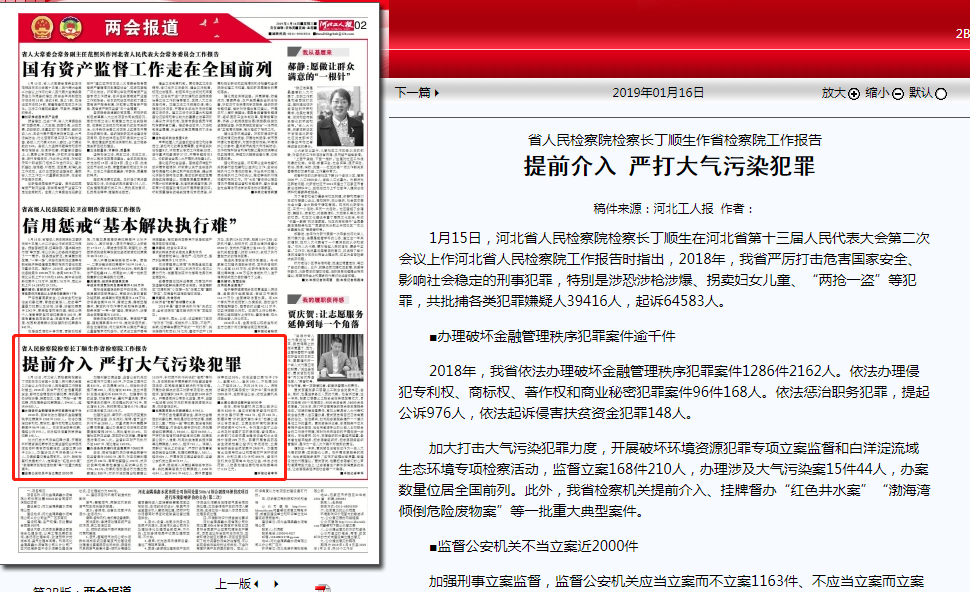 加大打击大气污染犯罪力度,开展破坏环境资源犯罪专项立案监督和白洋淀流域生态环境专项检察活动,监督立案168件210人,办理涉及大气污染案15件44人,办案数量位居全国前列。此外,我省检察机关提前介入、挂牌督办“红色井水案”“渤海湾倾倒危险废物案”等一批重大典型案件。
