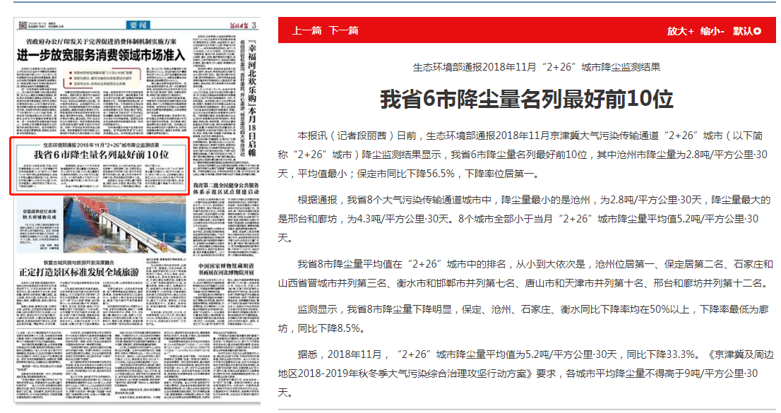 河北日报:生态环境部通报2018年11月“2+26”城市降尘监测结果 我省6市降尘量名列最好前10位