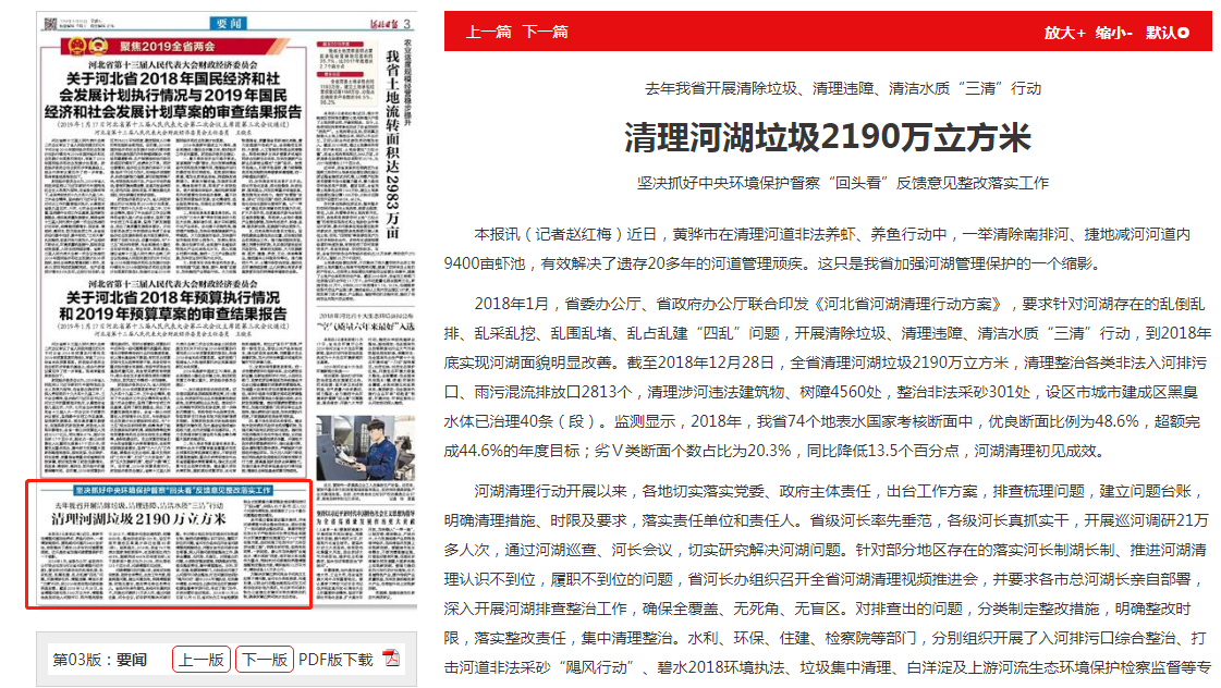 河北日报:去年我省开展清除垃圾、清理违障、清洁水质“三清”行动 清理河湖垃圾2190万立方米