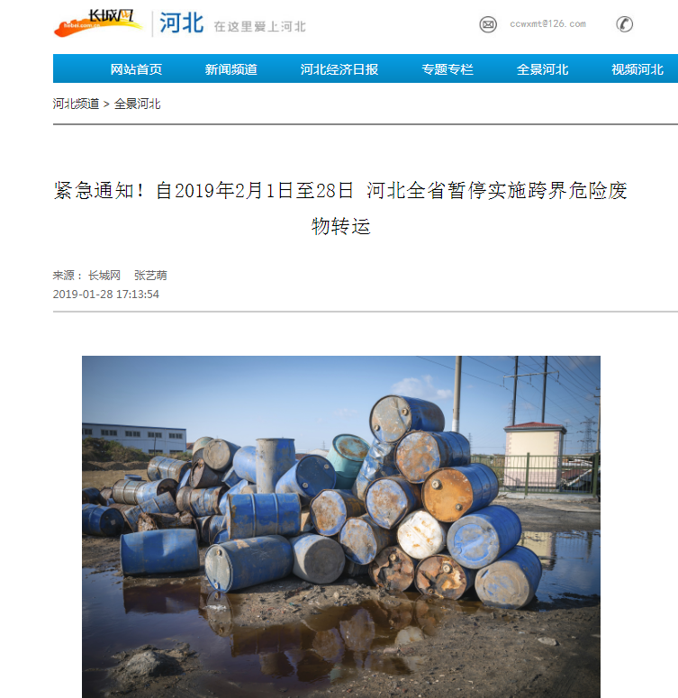 长城网:紧急通知!自2019年2月1日至28日 河北全省暂停实施跨界危险废物转运