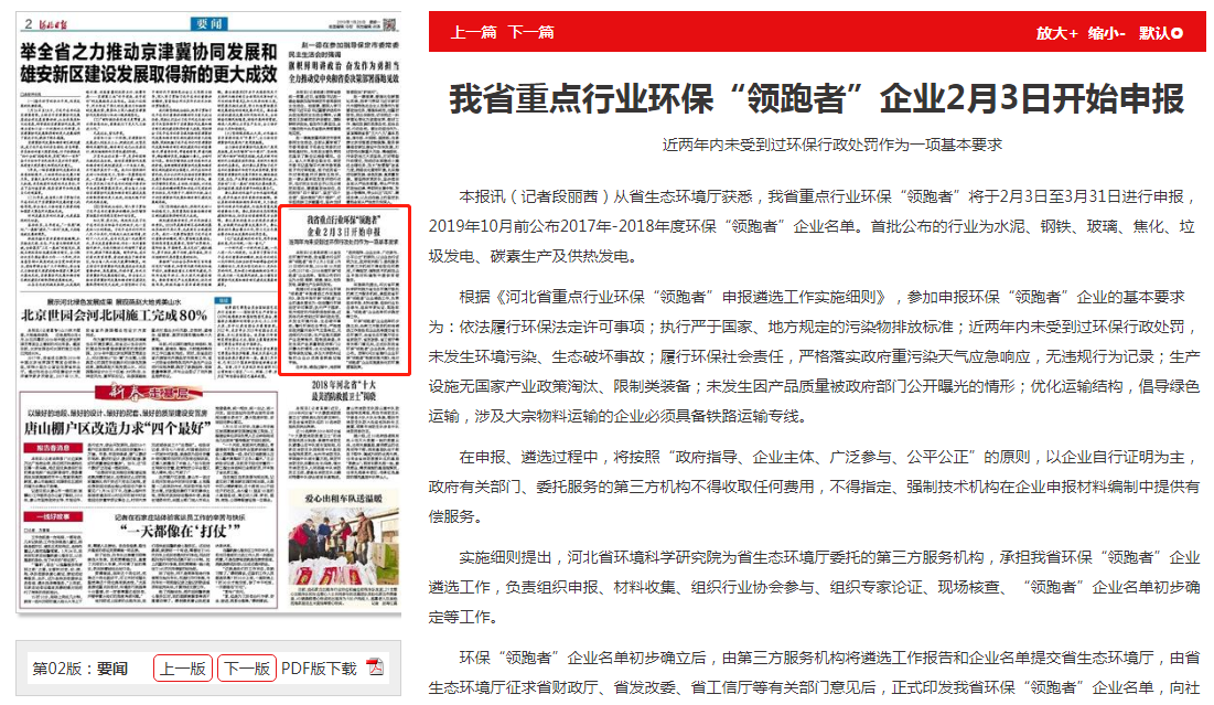 河北日报:我省重点行业环保“领跑者”企业2月3日开始申报