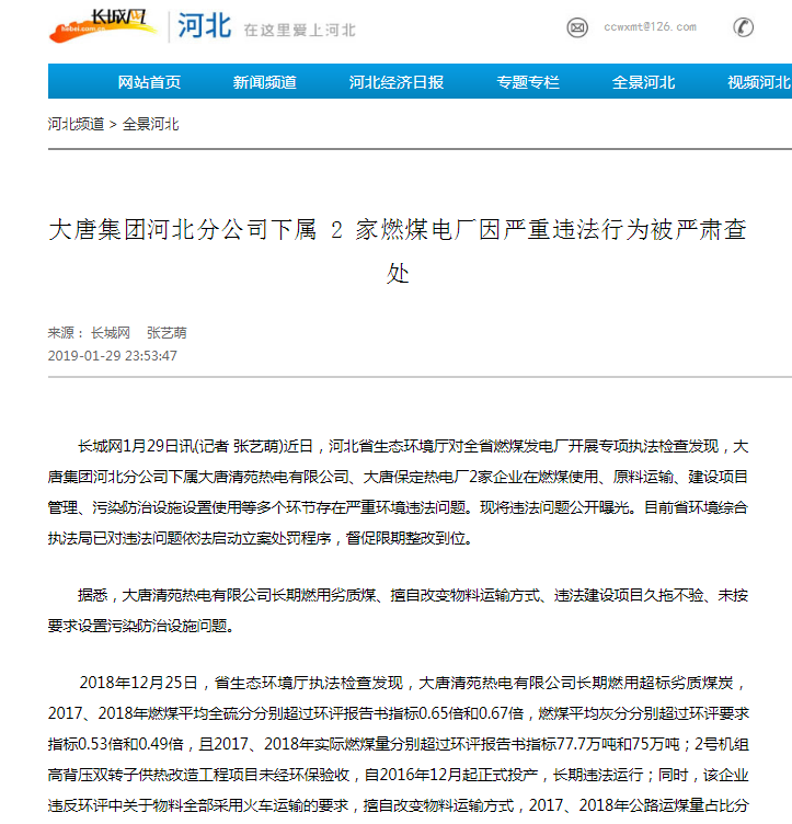 长城网:大唐集团河北分公司下属 2 家燃煤电厂因严重违法行为被严肃查处