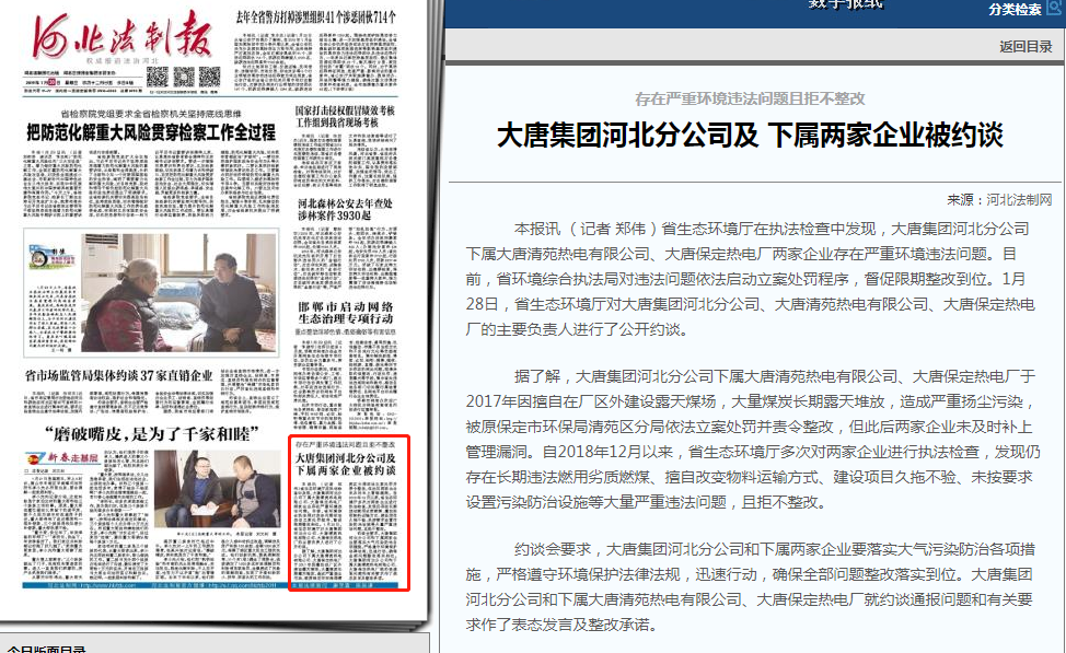 河北法制报:存在严重环境违法问题且拒不整改 大唐集团河北分公司及 下属两家企业被约谈