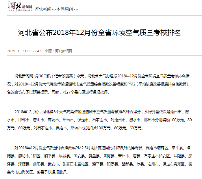 河北新闻网1月30日讯(记者段丽茜)今天,河北省大气办通报2018年12月份全省环境空气质量考核排名情况,对2018年12月份大气污染传输通道城市空气质量综合指数改善幅度和PM2.5平均浓度改善幅度排名倒数第1名的廊坊市予以预警提示。同时,对27个县市区进行通报批评。
