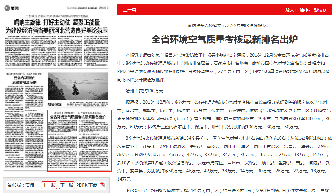 燕赵都市报:廊坊被予以预警提示 27个县市区被通报批评 全省环境空气质量考核最新排名出炉