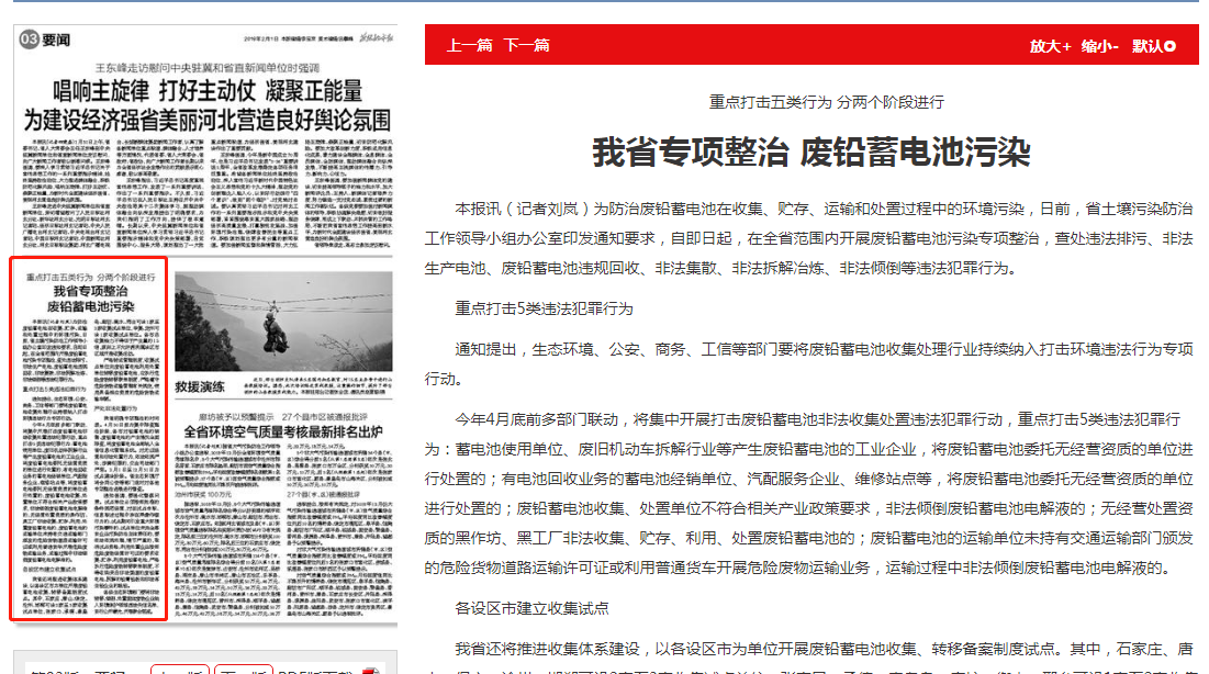 燕赵都市报:重点打击五类行为 分两个阶段进行 我省专项整治 废铅蓄电池污染