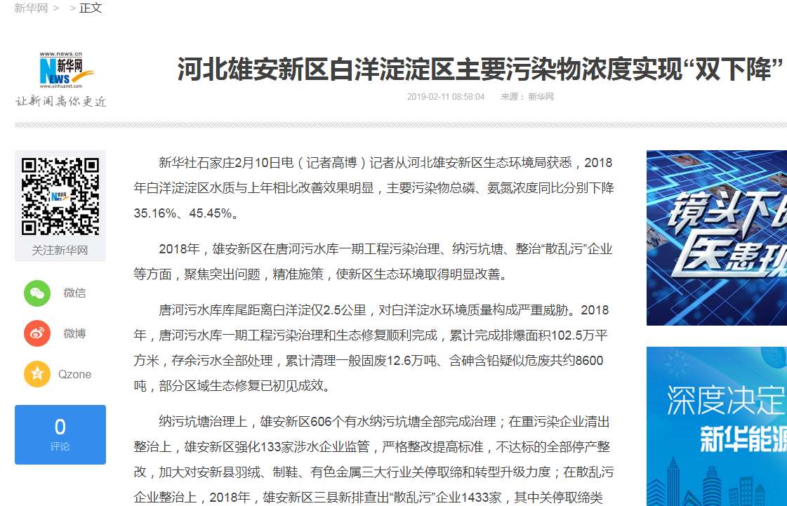新华网:河北雄安新区白洋淀淀区主要污染物浓度实现“双下降”