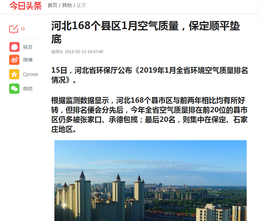 今日头条(说河北):河北168个县区1月空气质量,保定顺平垫底