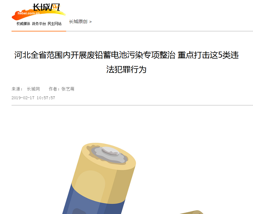 长城网:河北全省范围内开展废铅蓄电池污染专项整治 重点打击这5类违法犯罪行为