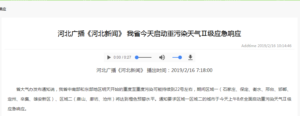 河北新闻广播《河北新闻》:我省今天启动重污染天气Ⅱ级应急响应