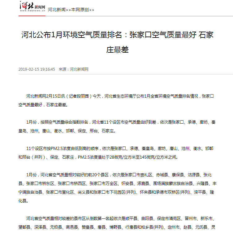 1月份,按照空气质量综合指数排名,河北省11个设区市空气质量由好到差,依次是张家口、承德、廊坊、秦皇岛、沧州、唐山、衡水、邯郸、保定、邢台、石家庄。